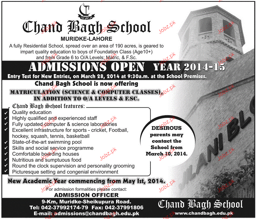 Chand Bagh School Admission in Matric, O Level and FSc in Lahore Read newspaper ad for exact details.