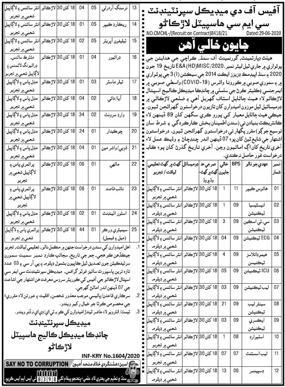 Health Department Government of Sindh Chandka Medical College CMC invites applications from medical, health, experienced and technical persons for the posts of Housekeeper, Anesthesia Technician, CT Scan Technician, ECG Technician, ICU Technician, Lab Technician, X-Ray Technician, Steward, Lab Assistant, Dispenser, Nursing Orderly, Record Keeper, Telephone Operator, Driver, Tailor Master, Aya, Dai, Chowkidar, Dhobi, Washer Man, Mali, Naib Qasid, Store Attendant, Sanitary Worker in Larkana Sindh Pakistan 2020.