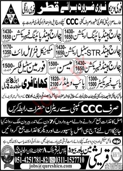 Qureshi Manpower Bureau jobs advertisement dated about 23 October 2022 in daily Express Newspaper invites application for the vacant post of mechanical fitter, pipe welder, charge hand piping irrigation, charge hand piping fabrication, mason, mechanical millwright, charge hand fabrication, pipe fabricator, charge hand str steel irrigation and foreman steel fixer in Qatar, qatar Qatar. Middle and Matric etc. educational qualification will be preferred.