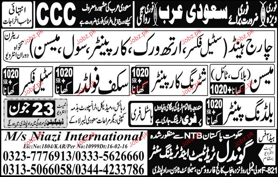 Charge Hand, Carpenters, Mason, Scaffolders Job Opportunity