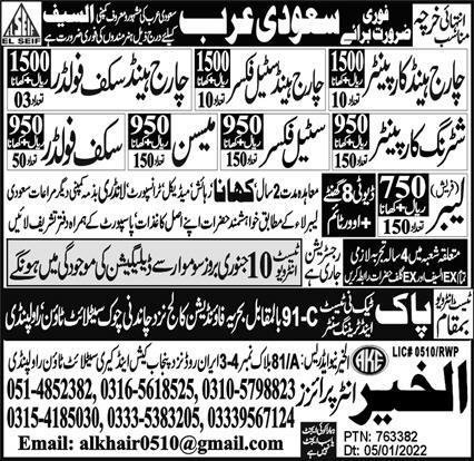 Pak Techni Test Center is looking for candidates for following posts as per job advertisement published in daily Express Newspaper of January 7, 2022 for location Saudi Arabia Saudi Arabia: