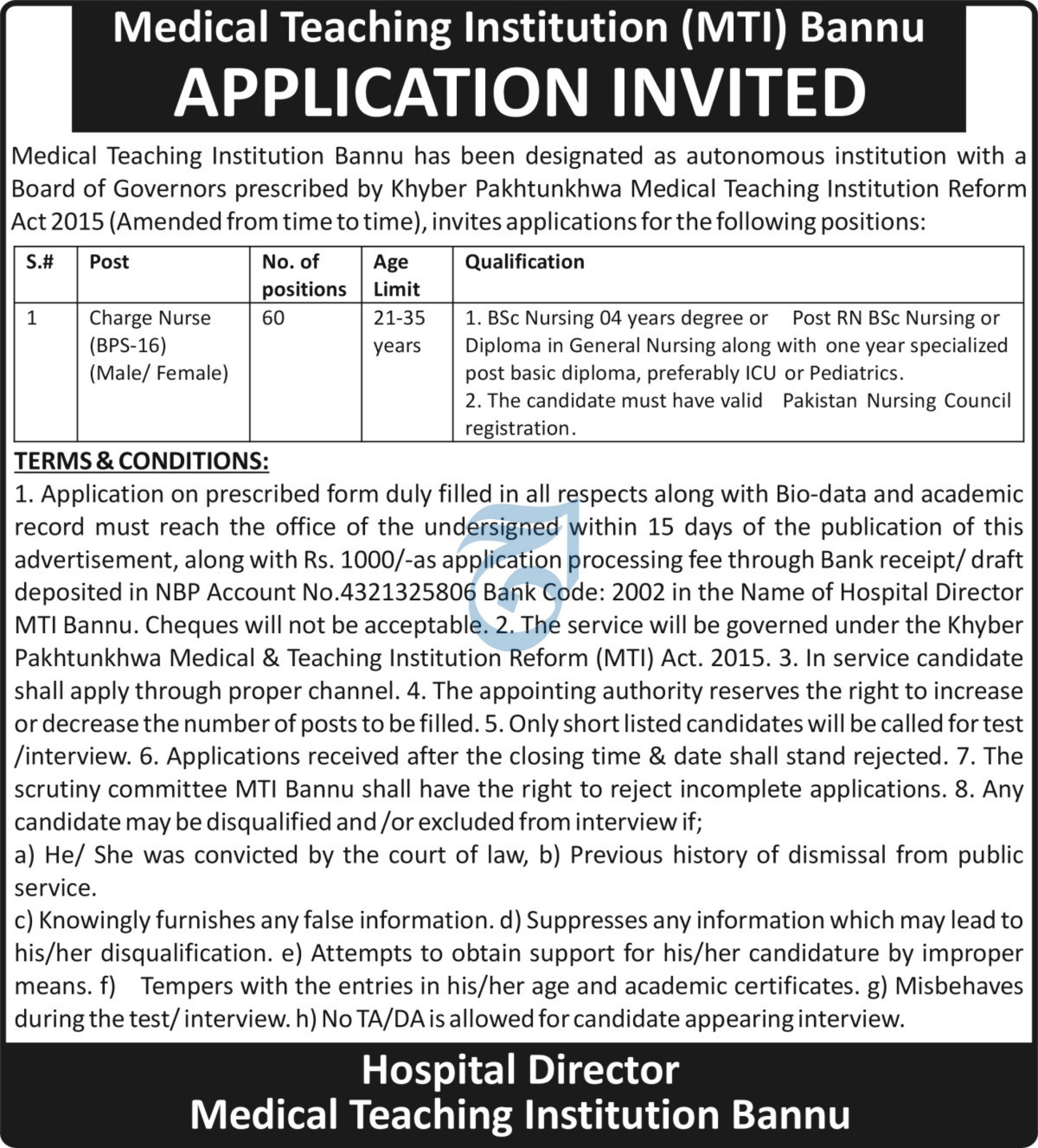 Medical Teaching Institution MTI Bannu Khyber Pakhtunkhwa KPK Pakistan invites applications from eligible candidates for the post of charge nurse as per advertisement of February 9, 2022 published in daily Aaj Newspaper. Educational qualifications required Others etc.