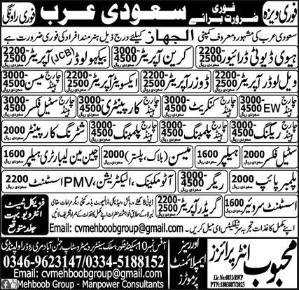 Mehboob Enterprises Overseas Employment Promoters jobs advertisement dated about 16 August 2023 in daily Express Newspaper invites application for the vacant post of pmv assistant, excavator operator, wheel loader operator, plumber pipe, chargehand steel fixer, plaster mason, mason, assistant surveyor, heavy duty driver, jcb operator, block mason, chargehand concrete, chargehand carpentry, chargehand mason, steel fixer, electrician, driver, crane operator, helper, chain man laboratory helper, chargehand ew, backhoe operator, chargehand racking, auto mechanic, rigger, htv driver, shuttering carpenter, dozer operator, chargehand plumbing and grader operator in Dammam, riyadh Saudi Arabia. Bachelor, DAE, Matric, Intermediate, B.E and BA etc. educational qualification will be preferred.