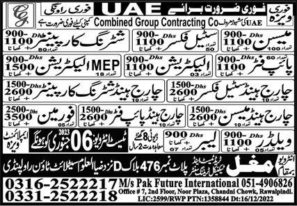 Vacant posts including steel fixer, labor, chargehand mason, chargehand pipe fitter, foreman, chargehand steel fixer, pipe fitter, mason, shuttering carpenter, welder, mep electrician, chargehand shuttering carpenter and electrician are announced in Mughal Trade Test & Technical Training Center Abu Dhabi, sharjah UAE as per 4 January 2023 advertisement in daily Express Newspaper. Preferred Education is Intermediate, Middle, Bachelor and Matric etc.