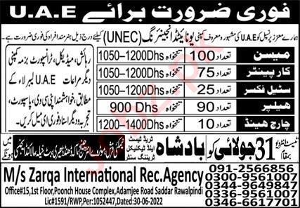Zarqa International Recruiting Agency Abu Dhabi, sharjah UAE invites applications from eligible candidates for the post of mason, chargehand, helper, carpenter and steel fixer as per advertisement of July 28, 2022 published in daily Express Newspaper. Middle and Matric etc. educational qualification will be preferred.