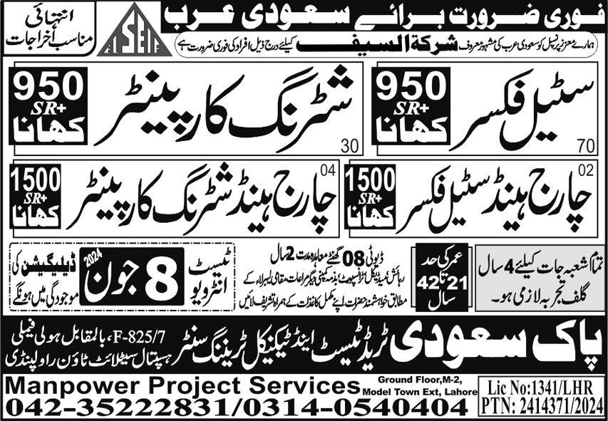 Pak Saudi Trade Test & Technical Training Center is looking for candidates for following posts as per job advertisement published in daily Express Newspaper of June 6, 2024 for location Dammam, riyadh Saudi Arabia: