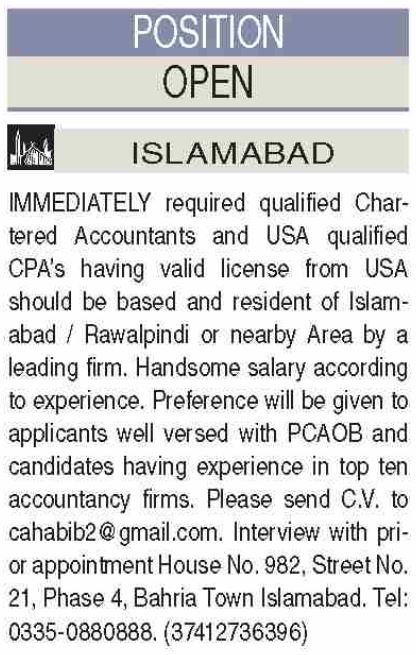 Private Company invites applications for job positions advertised in daily Dawn dated 14 December 2022 for following vacancies in Islamabad, islamabad Islamabad Pakistan.