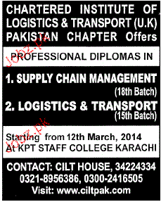 Chartered Institute of Logistics & Transport Admission in Diploma in Supply Chain Management and Logistics Transport in Lahore Read newspaper ad for exact details.