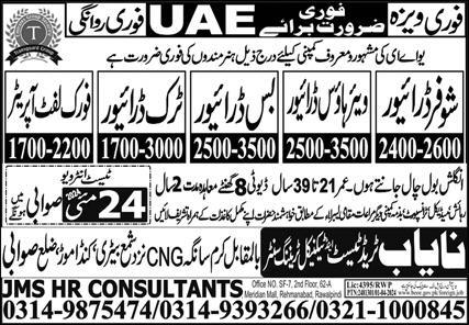 Nayab Trade Test and Technical Training Center Abu Dhabi, sharjah UAE invites applications from eligible candidates for the post of fork lift operator, chauffeur driver, bus driver, truck driver, warehouse driver and driver as per advertisement of May 23, 2024 published in daily Express Newspaper. Candidates with Matric and Intermediate etc. educational background will be preferred.
