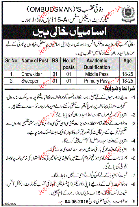 Chawkidars And Sweepers Job In Federal Mohtsib