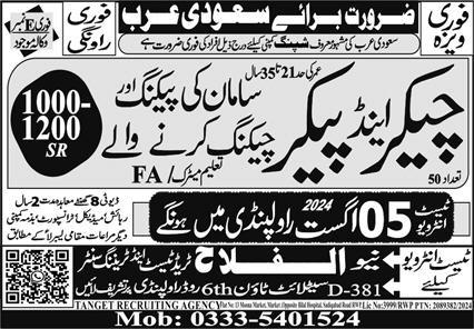 Latest Human Resource jobs and others Overseas jobs in New Al Falah Trade Test & Training Center closing date is around August 5, 2024, see exact from ad. Read complete ad online to know how to apply on latest New Al Falah Trade Test & Training Center job opportunities. Salary varies from 88000. Earn more by overtime. Facilities like accommodation, medical and transport mayNew Al Falah Trade Test & Training Center jobs advertisement dated about 3 August 2024 in daily Express Newspaper invites application for the vacant post of checker and packer in Dammam, tabuk Saudi Arabia. Educational qualifications required Intermediate and Matric etc.