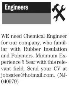Vacant posts including chemical engineer are announced in Private Company Karachi, karachi Sindh Pakistan as per 8 May 2022 advertisement in daily The News Newspaper. Persons with Bachelor and B.E etc. education can apply.