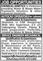 Chemical Kinetics Pvt Limited Lahore, lahore Punjab Pakistan invites applications from eligible candidates for the post of service engineer mechanical and autocad operator as per advertisement of March 27, 2022 published in daily Jang Newspaper. Educational qualifications required DAE and Bachelor etc.