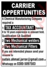 Chemical Manufacturing Company Lahore, lahore Punjab Pakistan invites applications from eligible candidates for the post of mechanical fitter, mechanical welder and tax accountant as per advertisement of June 29, 2025 published in daily Jang Newspaper. Educational qualifications required Bachelor, Matric and Middle etc.