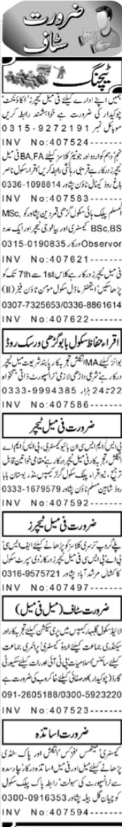 Private School invites applications for job positions advertised in daily Aaj dated 23 April 2022 for following vacancies in Peshawar, peshawar Khyber Pakhtunkhwa KPK Pakistan.