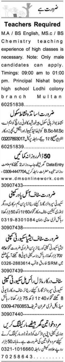 Private Company Multan, multan Punjab Pakistan invites applications from eligible candidates for the post of data entry operator, marketing staff, english teacher, security supervisor guard, laundry canteen staff, security guard, computer teacher, chemistry teacher and teacher as per advertisement of January 28, 2025 published in daily Express Newspaper. Candidates with MBA, M.sc, MA, Middle, BA, Matric, Bachelor and Intermediate etc. educational background will be preferred.
