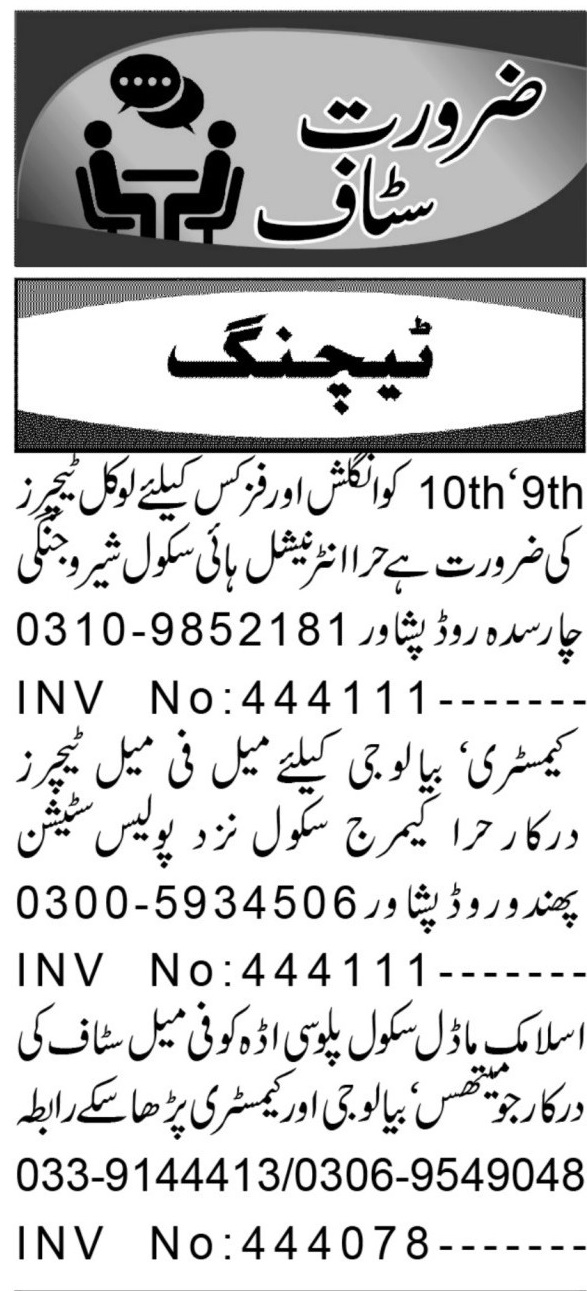 Vacant posts including physics teacher, female teacher, biology teacher, english teacher, chemistry teacher, mathematics teacher and teacher are announced in Private School Charsadda Road Peshawar, peshawar Khyber Pakhtunkhwa KPK Pakistan as per 14 August 2025 advertisement in daily Aaj Newspaper. Candidates with M.sc, MA, Bachelor, Others, B.ed, BA and Master etc. educational background will be preferred.