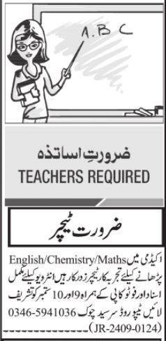 Vacant posts including female teacher, chemistry teacher, teacher, english teacher and maths teacher are announced in Academy Rawalpindi, rawalpindi Punjab Pakistan as per 7 September 2024 advertisement in daily Jang Newspaper. Preferred Education is M.sc, Master, Bachelor and BA etc.