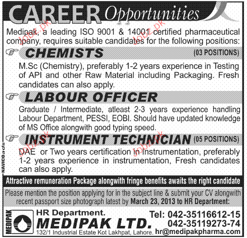 Chemists, Labour Officers And Instrument Technicians Wanted