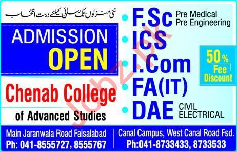 Chenab College of Advanced Studies Faisalabad, Pakistan are opened admissions fall 2019 for the classes of F Sc, ICS, I Com, FA IT, DAE Civil & Electrical Engineering. Read newspaper ad for exact details.