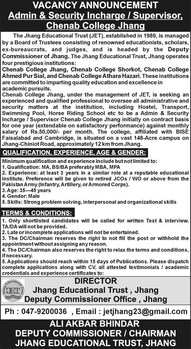 Vacant posts including supervisor, security incharge and admin incharge are announced in Chenab College Jhang, jhang Punjab Pakistan as per 18 January 2025 advertisement in daily Express Newspaper. Candidates with Bachelor, Master, MBA, BA and MA etc. educational background will be preferred.
