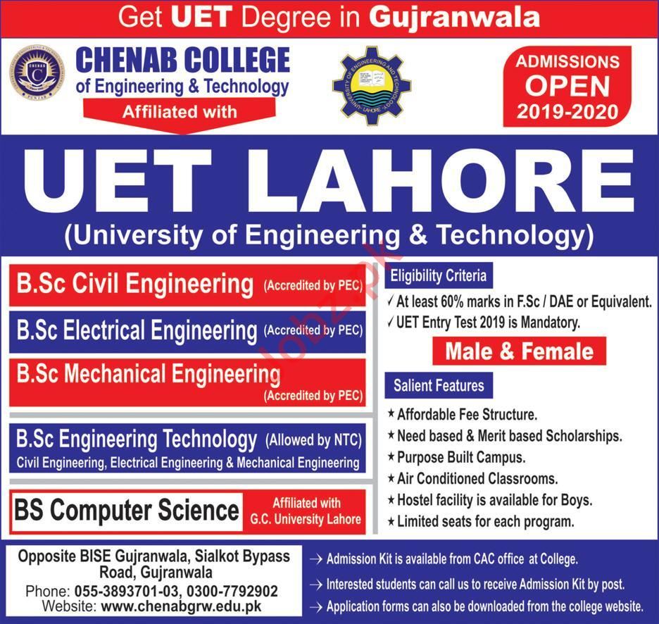 Chenab College of Engineering and Technology is offering admissions in B.Sc Civil Engineering, B.Sc Electrical Engineering, B.Sc Mechanical Engineering, B.Sc Engineering Technology in Civil Engineering, Electrical Engineering, Mechanical Engineering in Gujranwala. Chenab College of Engineering and Technology is affiliated with UET Lahore. Read newspaper ad for exact details.
