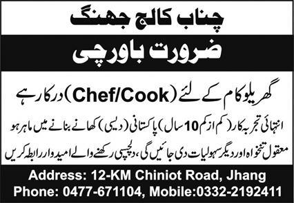 Chenab Colleges Jhang jobs advertisement dated about 24 June 2025 in daily Express Newspaper invites application for the vacant post of bawarchi, cook and chef in Jhang, jhang Punjab Pakistan. Middle, Matric and Intermediate etc. educational qualification will be preferred.