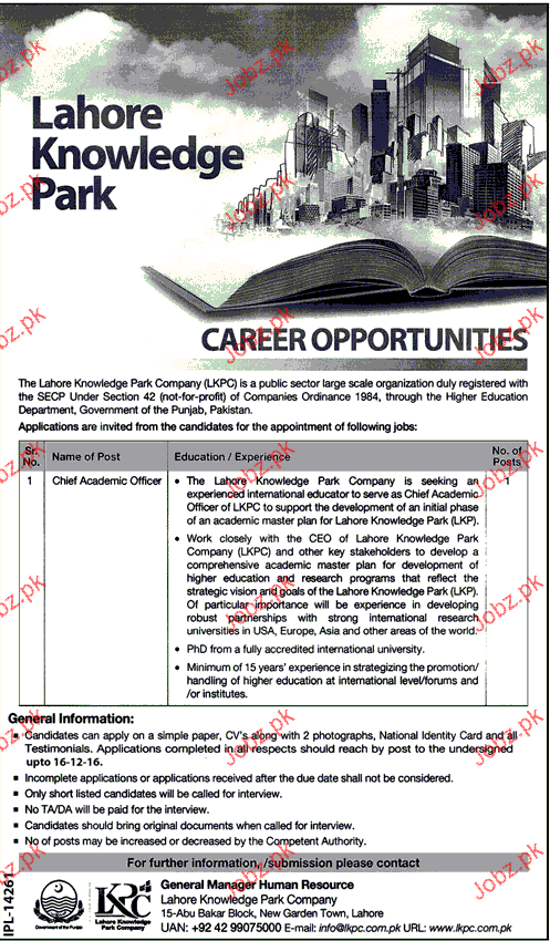 Chief Academic Officers Job In Lahore Knowledge Park Company