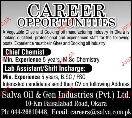 Chief Chemists And Lab Assistants / Shift Incharge Wanted