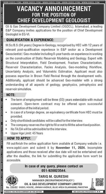 Oil & Gas Development Company Limited OGDCL invites applications for job positions advertised in daily The News dated 27 October 2024 for following vacancies in Islamabad, islamabad Islamabad Pakistan.