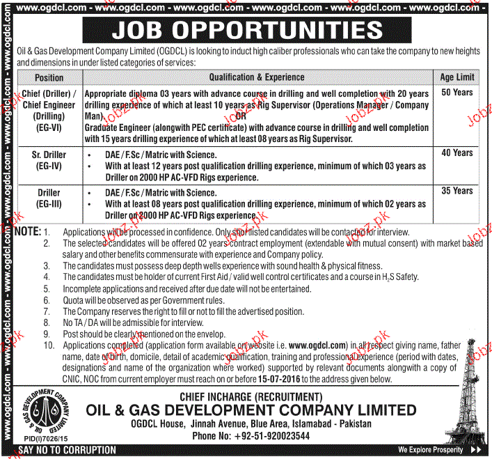 Chief Drillers / Chief Engineer, Senior Driller Job in OGDCL