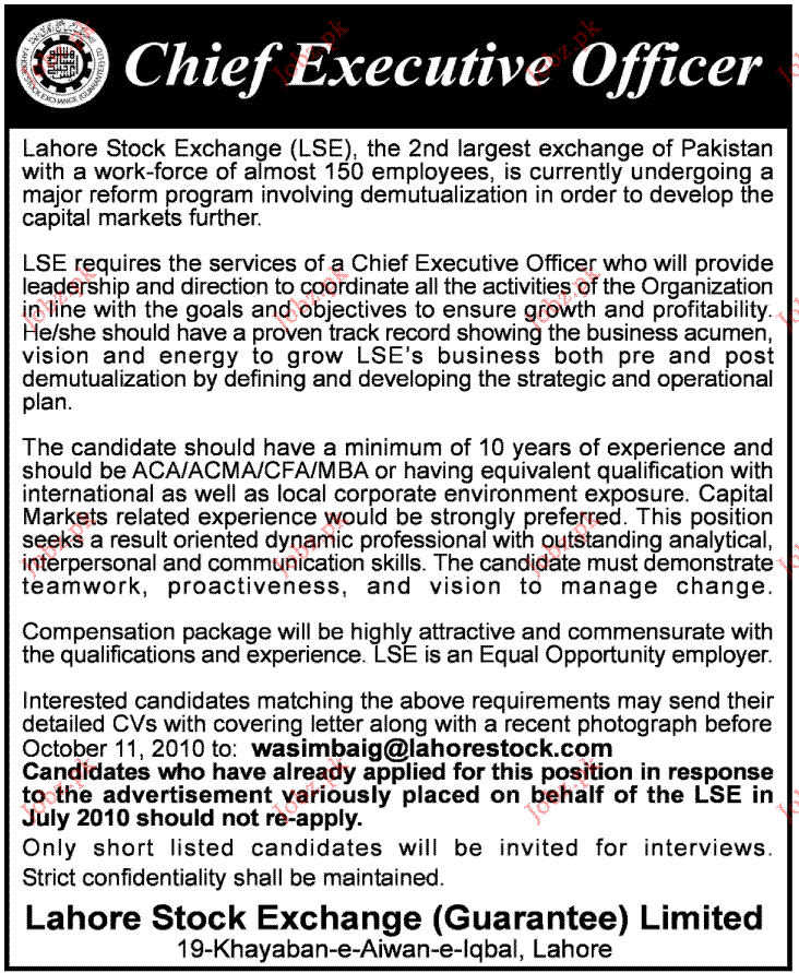 Apply as per details in job advertisement. Login to view further details of how to apply via https://www.jobz.pk online.