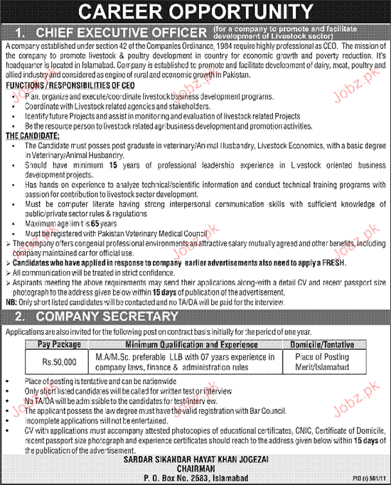 Apply as per details in job advertisement. Login to view further details of how to apply via https://www.jobz.pk online.