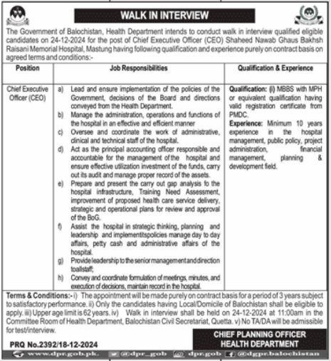 Health Department is looking for candidates for following posts as per job advertisement published in daily Jang Newspaper of December 19, 2024 for location Mastung, mastung Balochistan Pakistan: