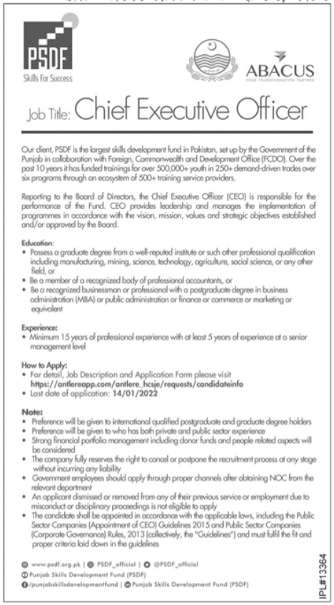 Vacancies in Punjab Skill Development Fund PSDF Advertisement December 2021