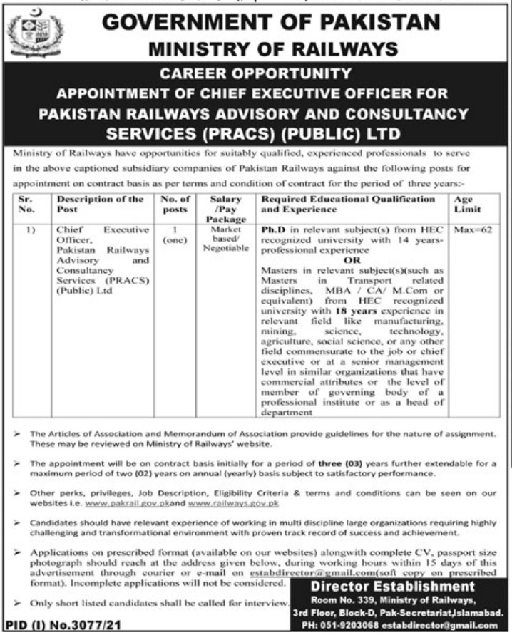 Chief Executive Officer PRACS Jobs In Ministry Of Railways