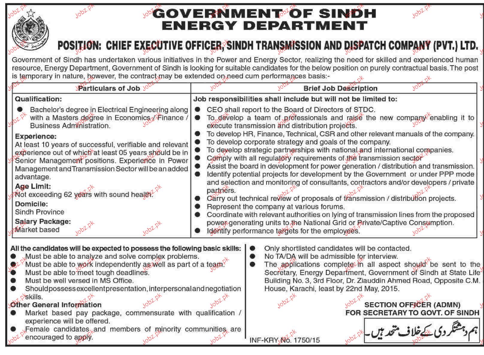 Apply as per details in job advertisement. Login to view further details of how to apply via https://www.jobz.pk online.