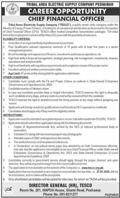 Tribal Areas Electricity Supply Company TESCO latest Government Finance jobs and others can be applied till 27 January 2025 or as per closing date in newspaper ad. Read complete ad online to know how to apply on latest Tribal Areas Electricity Supply Company TESCO job opportunities.