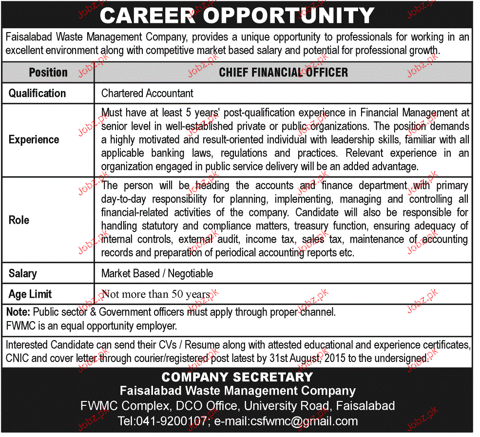 Apply as per details in job advertisement. Login to view further details of how to apply via https://www.jobz.pk online.