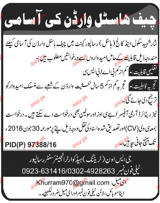 Chief Hostel Arden Job In Nisar Shaheed School And College