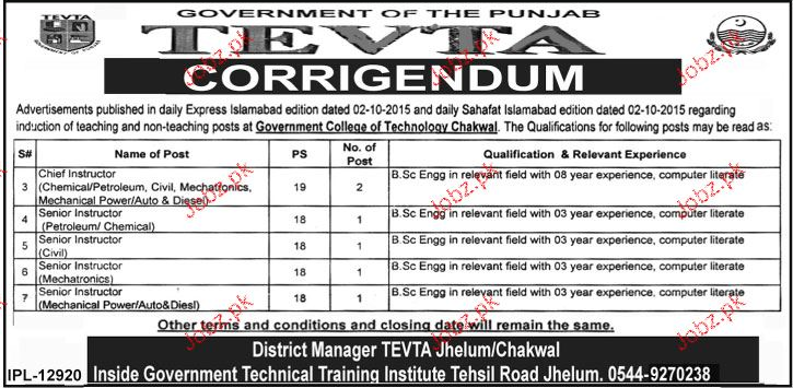 Latest Technical Education and Vocational Training Authority TEVTA Teaching Posts Jhelum 2025