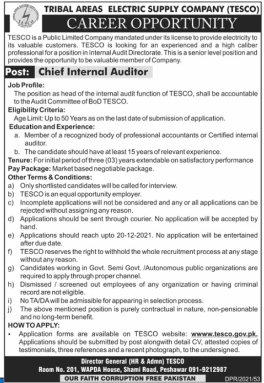 Vacancies in Tribal Areas Electricity Supply Company TESCO Advertisement December 2021
