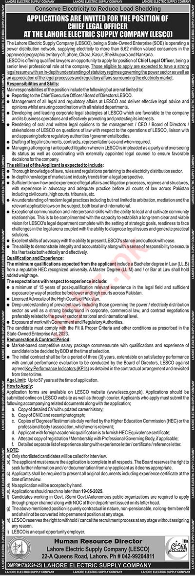 Lahore Electric Supply Company LESCO jobs advertisement dated about 4 May 2025 in daily Nawaiwaqt Newspaper invites application for the vacant post of chief legal officer in Lahore, lahore Punjab Pakistan. Educational qualifications required Master and Bachelor etc.