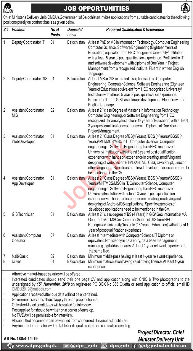 Government of Balochistan Chief Minister's Delivery Unit CMDU, an Government Organization in Quetta is looking for qualified, expert and Well-Mannered staff for their Organization for the Job of Deputy Coordinator IT, Deputy Coordinator GIS, Assistant Coordinator MIS, Assistant Coordinator Web Developer, Assistant Coordinator App Developer, GIS Technician, Assistant Computer Operator, Naib Qasid, Driver.