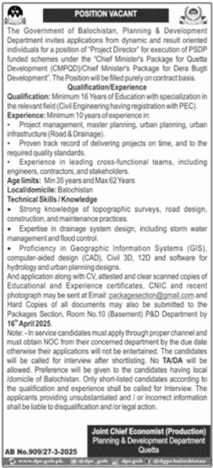 Chief Minister Package For Development CMPQD, Planning and Development Department jobs advertisement dated about 29 March 2025 in daily Jang Newspaper invites application for the vacant post of project director in Prince Road Quetta, quetta Balochistan Pakistan. Candidates with Master and MS etc. educational background will be preferred.