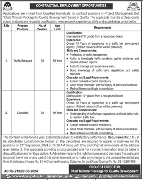 Vacancies in Chief Minister Package for Quetta Development Advertisement August 2024