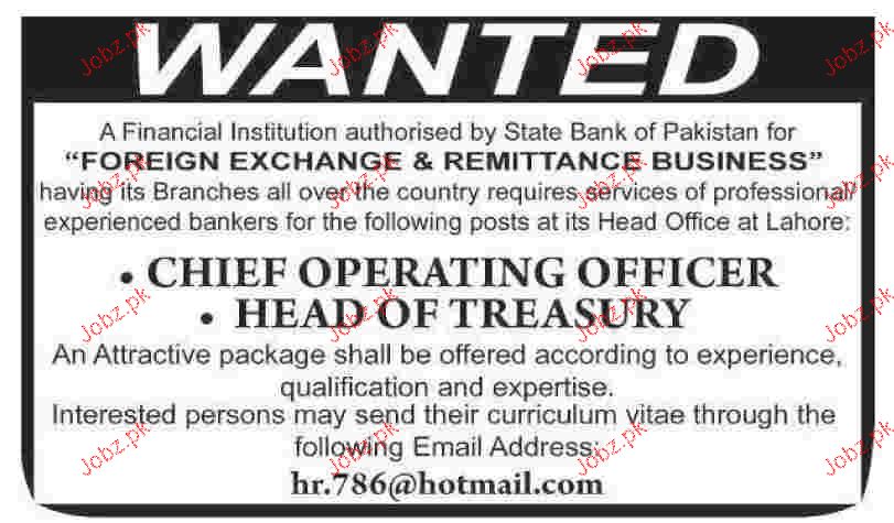 Chief Operating Officer and Head of Treasury are required in Lahore