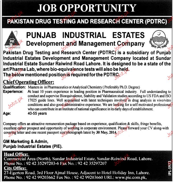 Chief Operating Officers are required in Punjab Industrial Estates in Lahore.
