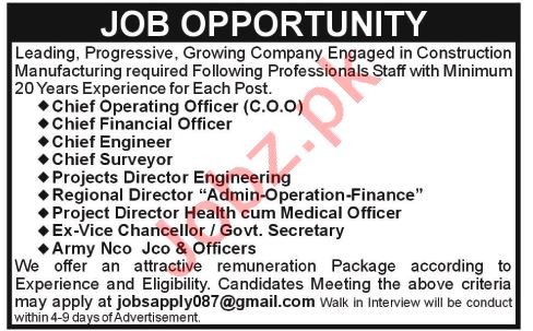 A well reputed Construction Manufacturing Company located in Karachi is seeking candidate for the posts of Chief Operating Officer, Chief Financial Officer, Chief Engineer, Engineer, Chief Surveyor, Project Director, Project Director Engineering, Regional Director, Regional Director Admin, Regional Director Operation, Regional Director Finance, Project Director Health, Medical Officer, Secretary, Security Officer, Security Manager.