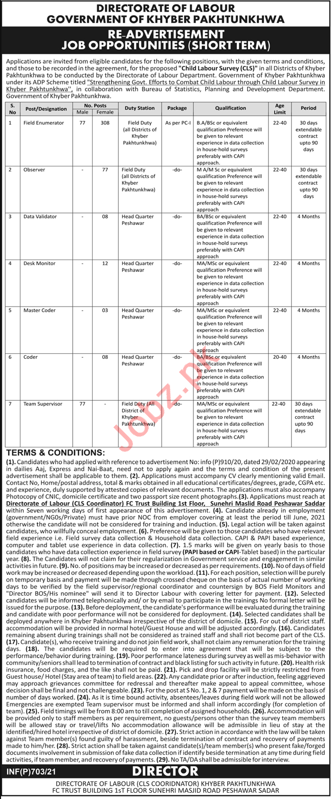 Child Labor Survey CLS Directorate Of Labor KPK Jobs 2021